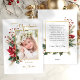 Your cherished holiday photo will make a memorable statement with this classic Christmas floral design. It features a single portrait-aspect photo template with a faux gold border surrounded by vibrant and festive red, green and gold winter botanicals and custom gold Merry Christmas calligraphy script greeting. Includes editable text fields. The back features editable message and personalisation text fields, a blank element with gold border and complementary floral embellishment.