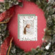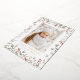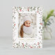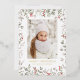 Elegant holiday card featuring your vertical photo surrounded by a border of red watercolor holly berries, eucalyptus leaves, and lush sage green foliage. Personalise the front of the botanical Christmas photo card with a custom greeting and your family name in gold foil lettering. The card reverses to display your custom message in white lettering with a dark sage background.