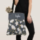 Elegant tote bag featuring a delicate gold and white orchids pattern on a dark grey background. The grey band on the upper part of the bag is customisable by adding your name (or other text) in a white calligraphy font.