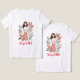 A graceful young woman with long, wavy brown hair stands delicately surrounded by soft botanical elements with pastel leaves. She wears a strapless pink dress, exuding elegance and poise. Her gentle expression, rosy cheeks, and relaxed pose give her a dreamy, romantic aura. The background is softly blended, enhancing the feminine, nature-inspired aesthetic of the illustration.