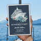 Elegant retirement party cruise ship invitation for women. Personalise it with her name and the party details including the date, cruise line, departure port, RSVP information, any any other info needed. Design with a watercolor boat and beautiful flowers on a navy blue background and silver details.