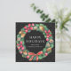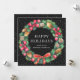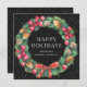 Custom black business holiday card featuring a watercolor wreath of conifer tree branches and cones, ribbons and ornaments on a black snowy background. Easily personalise this watercolor business holiday card with your company name and message.