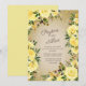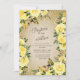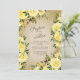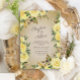 Elegant and romantic wedding invitation with beautiful yellow and gold watercolor flowers on a cream/brown background with sparkly glitter.