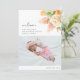 Elegant and cute birth announcement template card featuring floral illustrations of yellow roses, pink lavender, green foliage, and orange citrus fruit on the front. The back reveals a yellow polka dot background. There are 2 pictures of your newborn that can be added on this card (front and back). Perfect card to announce the arrival of your new baby with his/her birth stats. Great for both baby boy and girl. Perfect for summer and spring seasons!