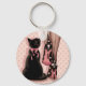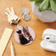 Black cat next to an elegant young woman in needle heels. Illustration vintage style thumbnail on a pink and dark gray striped background by artist Maryline Cazenave.