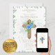 Blue Chrysanthemum, rustic wooden cross, Greenery leaves theme. Elegant modern Christian, Catholic faith wedding invitation with text template fields both sides for you to include wedding ceremony, reception, rsvp, gift registry brief wedding program. *** Elegante y moderna invitación de boda de fe católica y cristiana con campos de plantilla de texto en ambos lados para que usted incluya la ceremonia de boda, recepción, rsvp, registro de regalos breve programa de bodas.