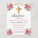 Celebre el bautismo de su hija con amigos y familiares con esta elegante postal de invitación de recepción de bautismo floral dorada y rosa. Este diseño presenta una hermosa cruz de oro con ramos florales rosados decorados contra un fondo blanco simple.