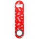 A white seamless repetition of Christmas elements - stockings, gingerbreadman, snowflakes, reindeer, Christmas ornaments, candles, Christmas tree, and the words "Merry Xmas" - in illustration, against a red background.