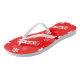 A pair of flip flops with a white seamless repetition of Christmas elements - stockings, gingerbreadman, snowflakes, reindeer, Christmas ornaments, candles, Christmas tree, and the words "Merry Xmas" - in illustration, against a red background.