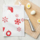 A red seamless repetition of Christmas elements - stockings, gingerbreadman, snowflakes, reindeer, Christmas ornaments, candles, Christmas tree, and the words "Merry Xmas" - in illustration.