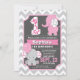Cute pink and grey elephant invitation for girl. Invite features grey and white chevron pattern and pink back.