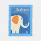 Cute fleece blanket for baby or toddler. Elephant is spraying water from his trunk with two blue birds looking on. Blue background. Add your child's name.