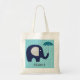 A cute elephant design tote bags sure to please both kids and adults who love elephants, features a cute navy blue elephant with grey chevron stripe ears and a navy and aqua blue chevron striped umbrella on an aqua patterned background.