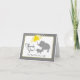 This cute yellow and grey baby shower thank you note card features a digital drawing of a baby elephant with her mother who is carrying a yellow umbrella. The background is accented with grey raindrops.