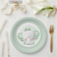 An adorable baby elephant with green ears and a green bow on its head on a green background is featured on these paper plates in 2 sizes and 2 shapes. Fun for gender neutral baby shower, birthday party or any special occasion. Also available in pink and blue. MATCHING items in our store.