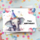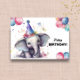 Join the parade of joy with our elephant birthday card, where a charming baby elephant, adorned with a party hat, leads the celebration for a whimsical and heartfelt birthday greeting. Ideal for zoo-themed celebrations or anyone who adores circus charm, the watercolor art illustration adds a touch of vibrant magic to your heartfelt sentiments.