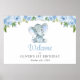 Elephant, Blue Flowers, First Birthday Welcome Poster