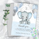 Let your guests know your gratitude with this adorable baby shower thank you card featuring blue and grey baby boy elephant with balloons and confetti. Back features soft blue watercolor. Easily customised by clicking personalise.