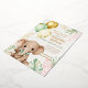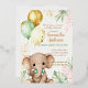 Welcome your little one with this sweet and whimsical baby shower invitation! This design features a charming hand-painted watercolor baby elephant adorned with a mint green bow, holding a bunch of festive gold and sage green balloons. Set against a lush backdrop of tropical monstera leaves and soft pink palm fronds, this invitation brings a trendy botanical boho feel to your celebration.