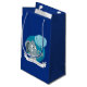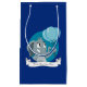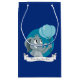 Personalised design with illustration of cute little elephant holding blue party balloons in blue circle on blue background; design for kids by Maxi Harmony; with customisable text template for you name or message