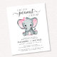 A cute and budget-friendly couple's baby girl shower invitation featuring "A Sweet Little Peanut Is On Her Way" written in soft grey modern typography and a stylish script, and a pastel pink watercolor of a baby girl elephant. Personalise the shower details in simple grey typography.