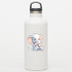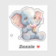 An adorable blue and pink elephant sits on his rump eating drippy strawberry ice cream.