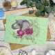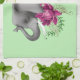 Side profile of an elephant with trunk up. Fuchsia lotus flowers and henna in a backdrop of green