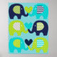 Elephant Love nursery poster features six elephants in navy blue, teal blue, and lime green with printed chevron stripe, flowers, and dotted ears on a blue and white diagonal stripe background!