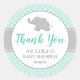 These gender-neutral baby shower"Thank You" stickers feature a cute grey baby elephant silhouetted on a grey-bordered white circle. The words "Thank You" appear in mint green cursive script typography, with mum-to-be's name and the date of the shower below in grey. The mint green polka dot pattern background is bisected by a grey ribbon design with a dashed white border to simulate stitching.