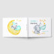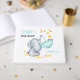 Personalised Baby Shower guest book with elephant theme. This cute design has two watercolor illustrations of a baby elephant in shades of grey, aqua green and yellow which is perfect for either a baby girl or a baby boy. The front cover has the baby elephant balancing an umbrella on his trunk, catching falling stars and love hearts. On the back cover, the baby elephant snuggled up on the moon and sound asleep under the stars. The template is set up ready for you to edit any of the wording, (your name, the event and the date) on the front cover and the spine.