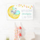 Personalise this cute birthday party banner for your little boy. The design has a watercolor illustration of a baby elephant snuggled with his blankie, fast asleep on the moon. The wording reads "happy birthday [name] [is age today!]" which you can customise for your child. A sweet, whimsical design with a colour palette of teal and grey.
