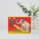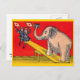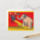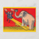 This post card has a vintage image of an etching of two children playing on a seesaw with an elephant holding the flag of Japan. The card is done in bright colours of red and yellow.