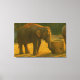 Celebrate the gentle intelligence of elephants with this richly textured acrylic-style art print, capturing a quiet moment in a wildlife sanctuary. Bathed in warm golden light, one elephant engages curiously with a cylindrical structure—perhaps a water trough or enrichment device—while its companion stands nearby, partially framed by foliage and stone.