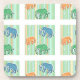 Beautiful seamless pattern of colourful cartoon elephants with shadows walking around over stripes in calming pastel shades of orange green and blue perfect for kid room as wallpaper or textile. © and ® Bigstock® - All Rights Reserved.