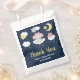 This cute and whimsical favour bag features an adorable baby elephant in a pink bow sitting on a cloud with falling stars. In the background is a starry night sky and crescent moon. The text combines handwritten script and sans serif fonts for a stylish and modern look. This is perfect for a baby shower.