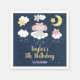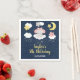 This cute and whimsical napkin features an adorable baby elephant in a pink bow sitting on a cloud with falling stars. In the background is a starry night sky and crescent moon. The text combines handwritten script and sans serif fonts for a stylish and modern look. This is perfect for a birthday party.