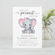 A cute baby girl couples shower invitation with "A Sweet Little Peanut Is On Her Way" written in a mixture of soft grey modern typography and a stylish script, and a pastel pink watercolor of a baby elephant. Personalise the names of the mother and father and the baby sprinkle details in simple grey typography.