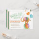 Cute whimsical baby elephant and rhinoceros circus show showering invitations. Watercolor art of a balancing elephant standing on a soft babies ball, showering bubble hearts and with two heart shaped balloons tied to the elephants tail on the front and a unicycling rhino on the reverse. Whimsical unisex baby shower invitations in shades of brown, green, purple, orange and aqua blue. Matching items also available. Personalise with your baby shower details. © Uniquely painted in watercolor and designed by Sarah Trett www.sarahtrett.com for www.mylittleeden.com on zazzle.