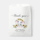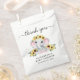 Cute thank you party favour bags for your baby girl shower with "thank you" written in a soft grey script with swashes and a pastel pink watercolor of a baby elephant adorned in sunflowers. Personalise the mother-to-be's name and shower date in simple grey typography.