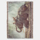 A woven blanket shows a young Asian boy, lying on the back of a large, reclining elephant, reading a book. The boy is shirtless, wearing shorts and brown shoes. The elephant is grey, with long tusks, and is lying on a bed of leaves. The background is a blurry forest scene. The blanket has a fringed edge. The image is shot with soft, diffused lighting, giving it a warm, nostalgic feel.