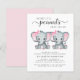 A cute and budget-friendly twin baby girls drive by shower invitation with "Two Sweet Little Peanuts Are On Their Way" written in soft grey modern typography and a stylish script, and two pastel pink watercolors of baby elephants. Personalise with the mother-to-be's name and the drive by shower details in simple grey typography.