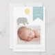 Customisable birth announcement featuring a grey elephant illustration with a yellow balloon.