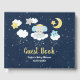 This cute and whimsical guest book features an adorable baby elephant in a gold crown sitting on a cloud with falling stars. In the background is a starry night sky and crescent moon. The text combines handwritten script and sans serif fonts for a stylish and modern look. This is perfect for a baby shower.