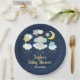 This cute and whimsical plate features an adorable baby elephant in a gold crown sitting on a cloud with falling stars. In the background is a starry night sky and crescent moon. The text combines handwritten script and sans serif fonts for a stylish and modern look. This is perfect for a baby shower.