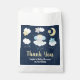 This cute and whimsical favour bag features an adorable baby elephant in a gold crown sitting on a cloud with falling stars. In the background is a starry night sky and crescent moon. The text combines handwritten script and sans serif fonts for a stylish and modern look. This is perfect for a baby shower.