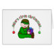 Baby's First Christmas greeting cards, tote bags, T-shirts, and other items featuring a baby in a green suit and striped stocking cap and candy cane striped text.