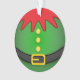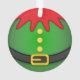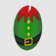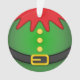 One of Santa's elves in their holiday green jumpsuit with a red jester-like collar. The jumpsuit is adorned with gold buttons and a leather belt with a gold buckle.