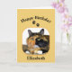 A distinctively beautiful calico cat brings birthday wishes. You can easily personalise this card by changing the name on the front and inside.