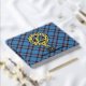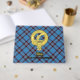 Clan Elliot crest badge surrounded by a strap and buckle over ancient tartan background. Custom front, back and spine text.