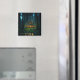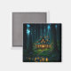 Magnet of a peaceful Tolkienesque Elven castle in a serene forest by a pond at dusk. Fairy lights illuminate the surroundings. Image was made with Leonardo.ai.